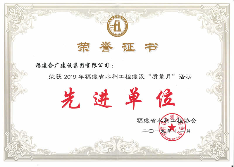 • 2019年福建省水利工程質量月榮譽證書