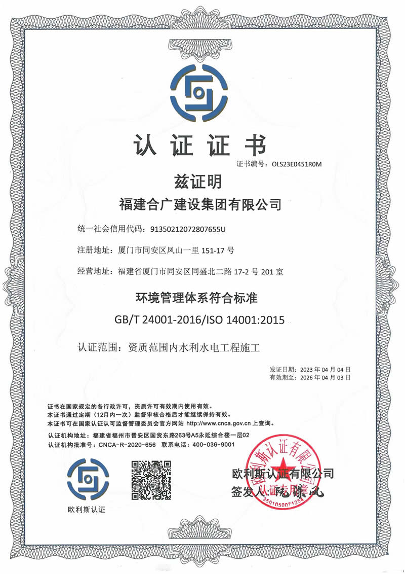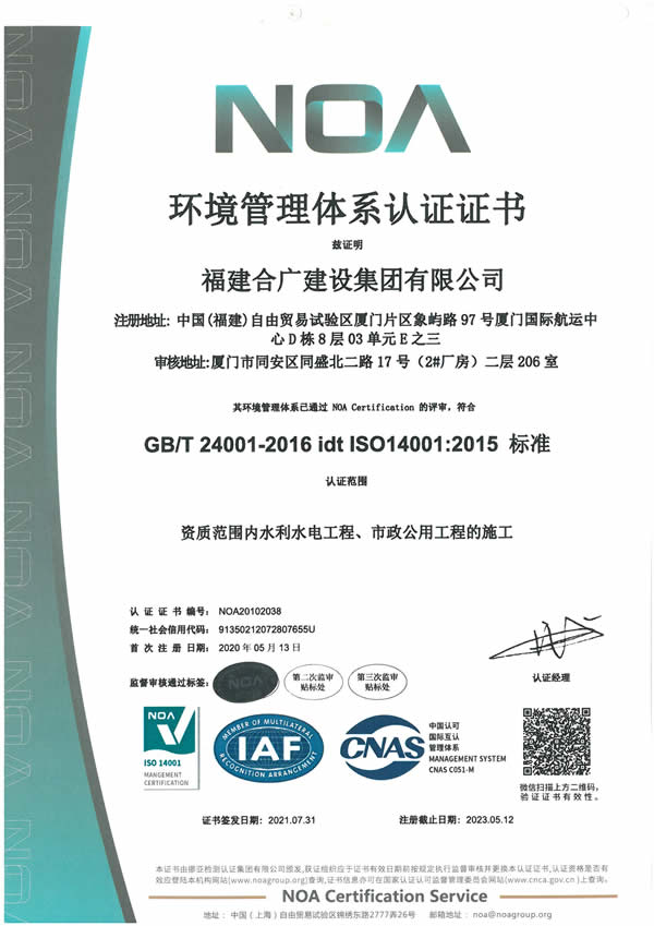 • 2020年環境管理體系認證證書